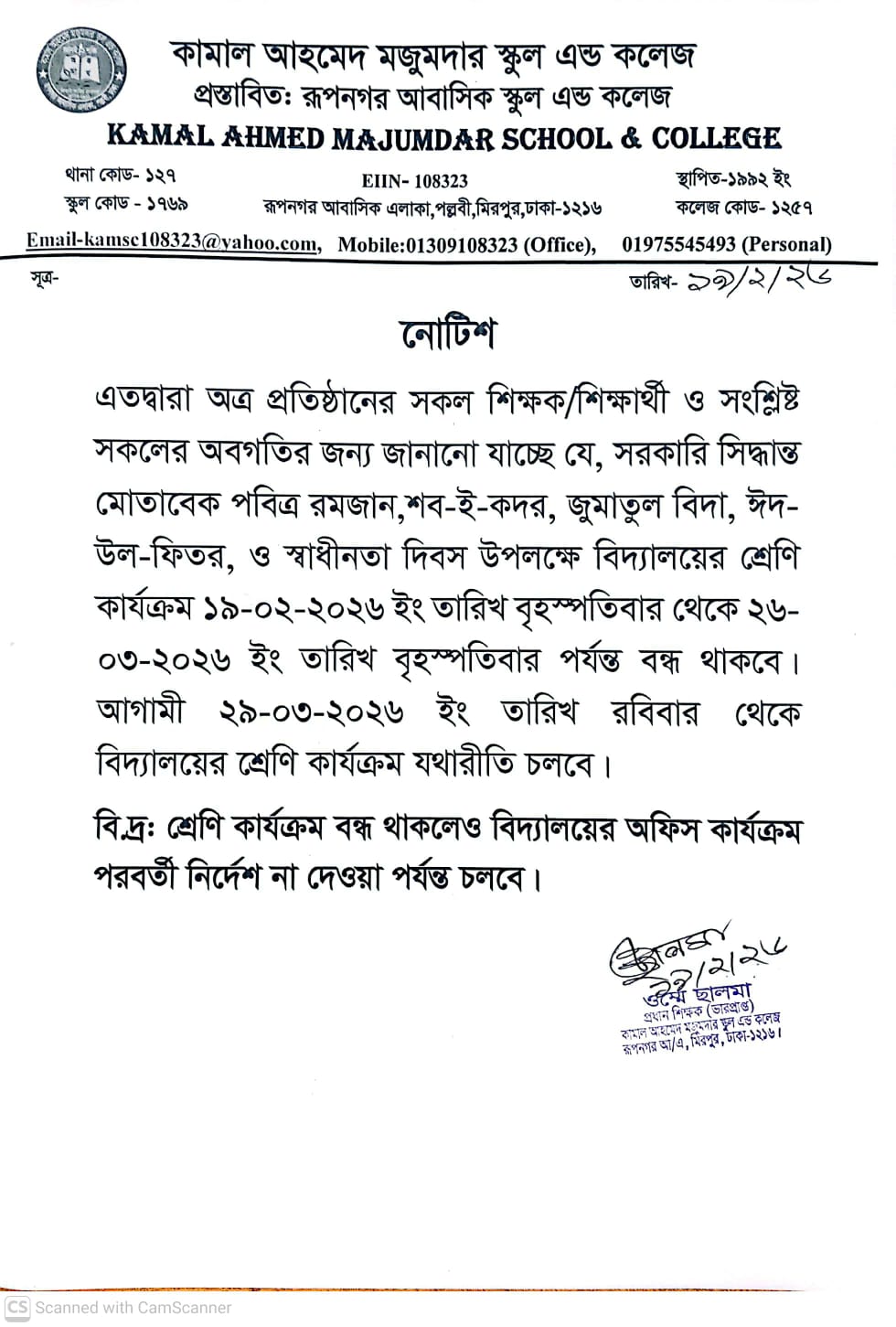 | Feb 19, 2026 | পবিত্র রমজান ও ঈদ-উল-ফিতর উপলক্ষে বিদ্যালয়ের শ্রেণি কার্যক্রম বন্ধের নোটিশ | |