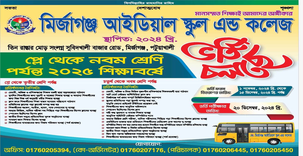 Read More →মির্জাগঞ্জ আইডিয়াল স্কুল এন্ড কলেজ এ , 2025 শিক্ষাবর্ষে প্রথম শ্রেণি থেকে নবম শ্রেণি পর্যন্ত ভর্তি চলছে।